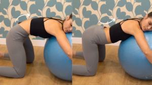 Per fer-ho correctament, primer ens col·loquem de genolls amb les cames a 90º del terra i recolzem la part superior del cos sobre la fitball.